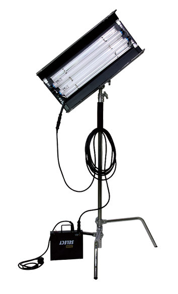 The double select system is equivalent to bouncing a 575 watt HMI off a white poly board. it consists of a two lamp fixtures operated by a remote ballast. The select ballast is flicker free at any camera speed or shutter angle with controls to power two lamps or one at high-output or standard-output settings. The same ballast will power your choice of 4ft, 2ft, or 5-inch fixtures. The double select system serves well as an edge light, or above the camera as an ‘obie’ light. When lighting close-ups of a face, the 4ft system provides a very flattering soft light that seemingly “wraps around" the face. The extended 6-inch barndoors and the louvers allow for a greater degree of light control. The double system is a multi-purpose, everyday light. By combining two doubles; you have the light output of a 4 bank. By powering onIy one lamp in the double fixture, the output equals a single select system. Like the 4 ban k and single systems; the double's wiring harness allows the lamps to be operated outside the fixture. This fixture frees up the lamps to be used for custom instalNations. To change the colour temperature, select the appropriate lamp.