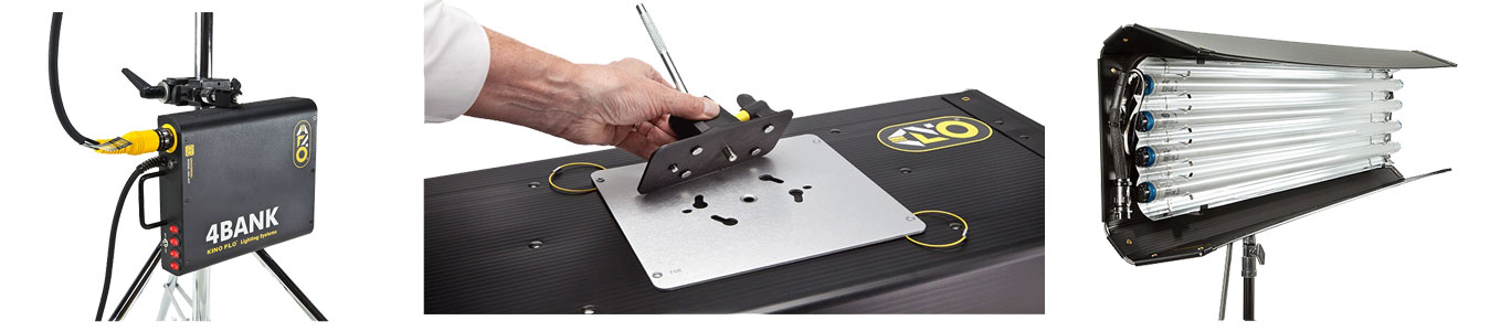 Kino Flo’s award winning 4ft 4Bank portable lighting system is reintroduced with a new design. With new universal voltage from 100VAC to 240VAC, the 4Bank can be used anywhere in the world. The 4Bank is brighter than a 1,000W softlight, yet draws only 2.6A (120VAC), 50% less than the previous model. New features include new graphics, new color coded connectors and new power switches. The lighter weight 4Bank ballast has the same classic features: individual light control, HO/Standard switching and the same high quality standards: flicker-free, instant-on, dead quiet operation. Color temperature doesn’t shift when light levels change. With its new and classic features, the popular 4Bank remains to be a favorite tool among lighting professionals in the studio or on location.